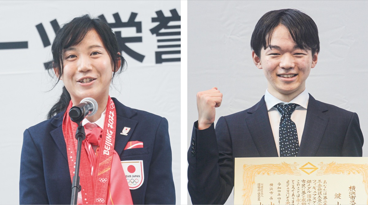 個人、団体と2つのメダルを獲得した鍵山選手は、六角橋中学校出身で横浜銀行アイスアリーナ=広台太田町=を練習拠点としていた。現在は愛知県に拠点を移している。4月27日に市庁舎で開催された贈呈式では、山中竹春市長や(公財)横浜市スポーツ協会の山口宏会長、横浜市会高橋正治副議長が出席し、賞状や記念品を手渡した。鍵山選手は「横浜で過ごした中学、高校の6年間で選手として、人として成長できた。4年後はもっと良い色のメダルをとりたい」と話した。