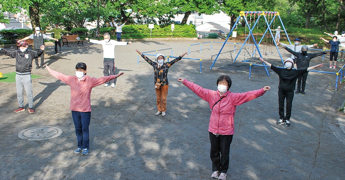 「おはようございます」。滑り台に置かれたラジオから放送開始を告げるアナウンスが流れると、集まった70代から80代の40人ほどの住民は広場内に素早く等間隔に散り、「ラジオ体操第一」「第二体操」で10分間、体を動かした。