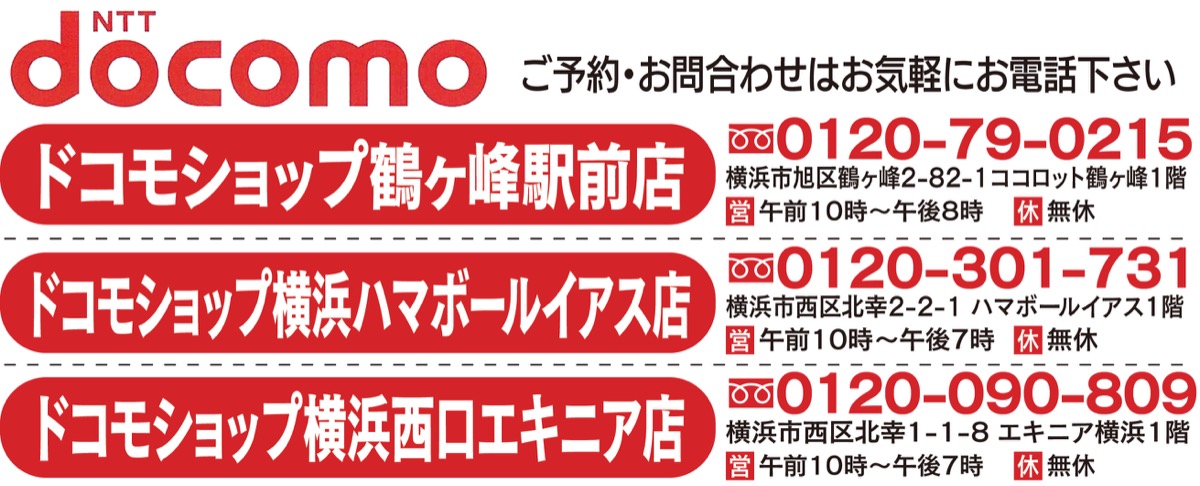 ドコモショップ鶴ヶ峰駅前店・横浜ハマボールイアス店・横浜西口エキニア店