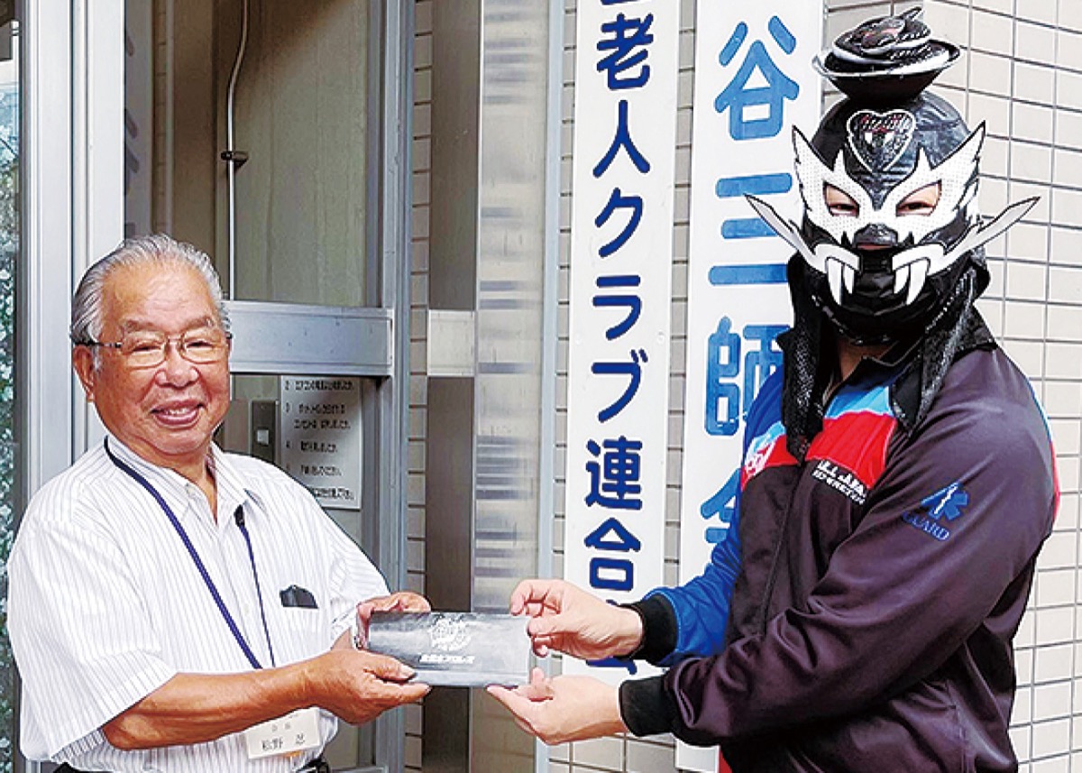 大会を前に同団体のブラックめんそーれ選手が保土ケ谷区老人クラブ連合会を訪れ、同連合会の松野忍会長に大会のチケットを贈呈した。
