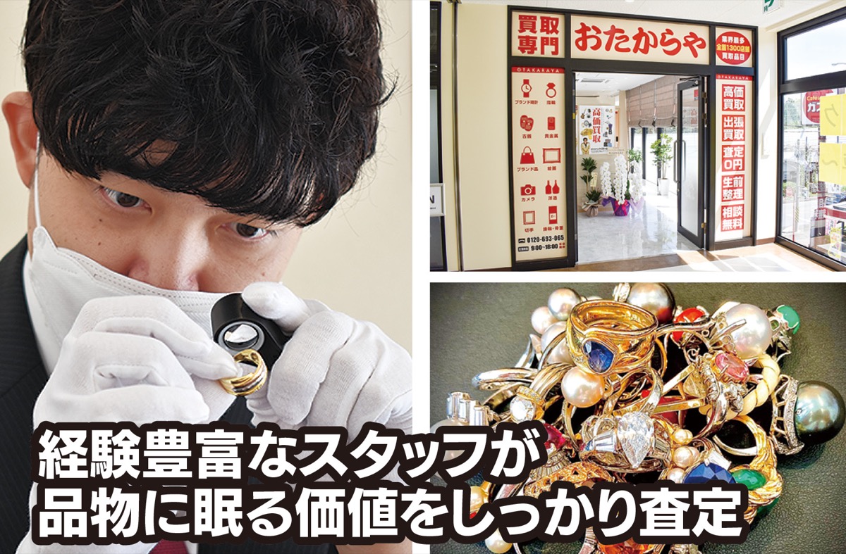 7月に出来たばかりの同店は商業施設内にあるので、駐車場は200台とスペースたっぷり。ブランドバッグや着物、洋酒、絵画など持ち込みが大変な品でも安心だ。普段の買い物ついでの持ち込みもしやすい。「高価買取なら今は、貴金属・プラチナやブランド時計がおススメです」と阿部店長。出張買取もあるのでまずは電話で予約を。