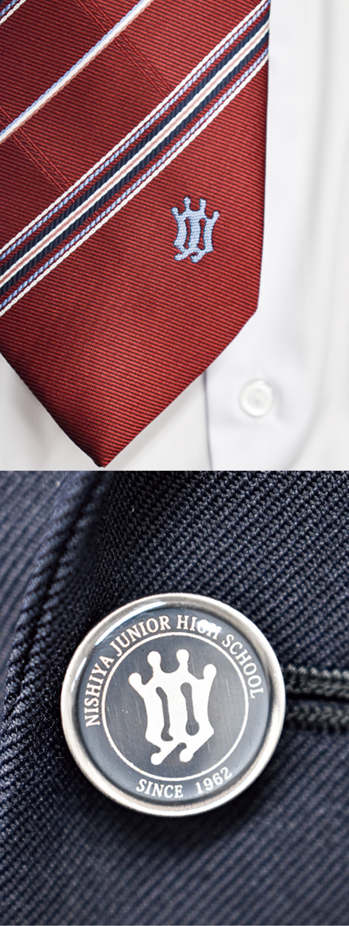 ブレザーの胸元のワッペンは、校章をモチーフに在校生がデザイン。ネクタイは生徒の元気な表情を引き出すえんじ色に青のラインが入った。剣先には校章が描かれている。スラックスは男女ともに同じ柄のチェックで、校舎から見える広い空をイメージしたブルーが使われている。