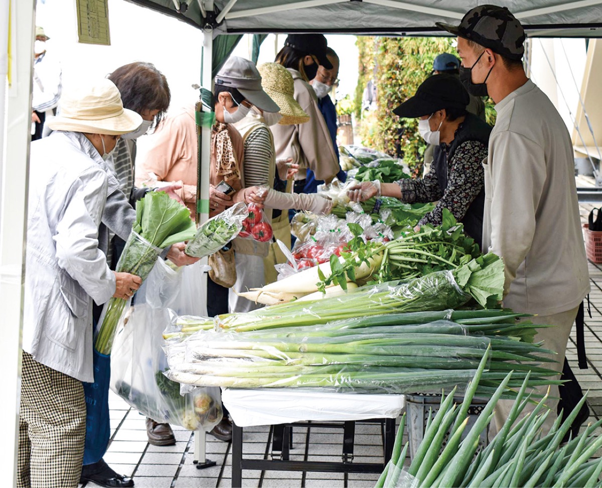 旬なほどがや野菜が午前9時30分から販売され、売切れ次第終了となるこの朝市は、地産地消を推進する市民グループ「ほどがや産直便」と区の共催で毎回多くの人が訪れる人気企画。新型コロナウイルス感染予防の観点から、待合スペースにソーシャルディスタンスを取り、購入者は順番に入場するなど、「密」を避けるための工夫を施しながら実施する。