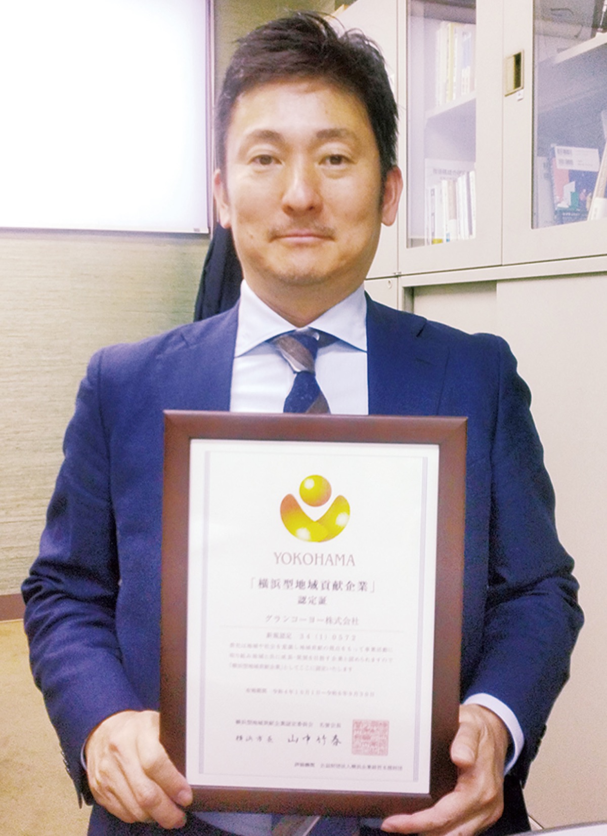 横浜市が地域とともに永続的に成長・発展している企業を認定する「横浜型地域貢献企業事業」の新規認定企業を発表され、新桜ケ丘の「グランコーヨー(株)」(大庭公善代表取締役)が認定を受けた。
