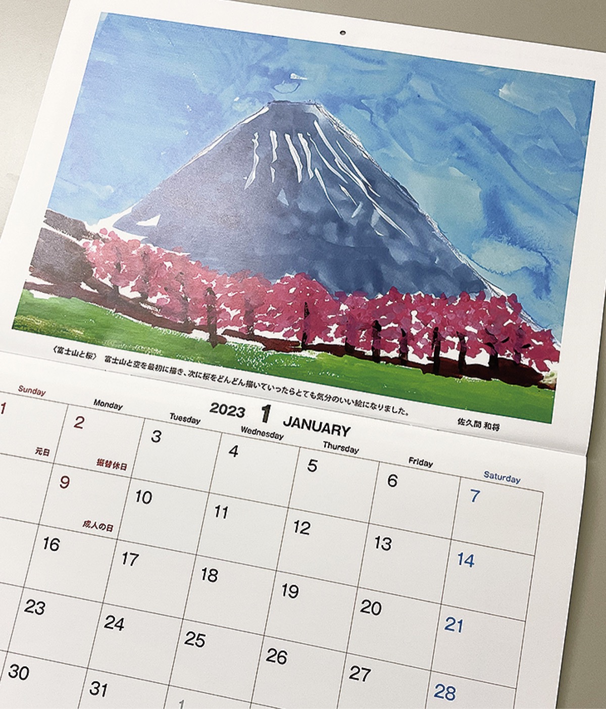 「山のある風景」をテーマにした今年は4月から9月にかけてワークショップが開かれ、富士山や山梨県韮崎市の「わに塚の桜」、「アメリカの原風景」とも言われるモニュメントバレーなどを独自の感性でキャンバスに描いた力作の中から、プロのデザイナーが「カレンダーとしての商品価値がある作品」12作品を選定した。