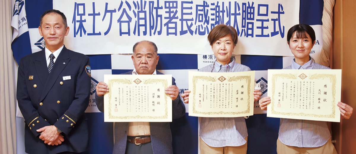 路上で倒れている高齢女性を救助したとして、西谷のデイサービス事務所の従業員2人と近隣に住む男性に保土ケ谷消防者から感謝状が贈られた。