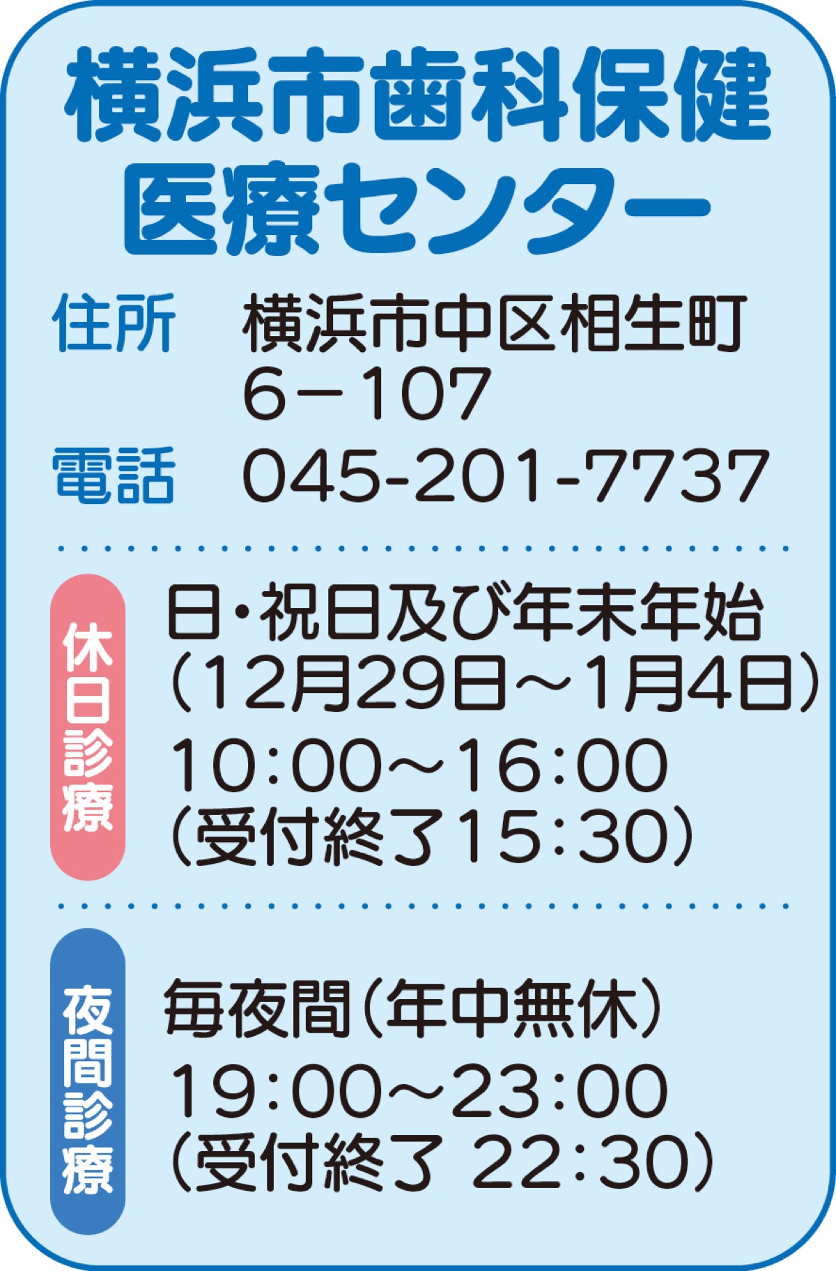 横浜市歯科医師会では、年末年始も横浜市歯科保健医療センターで休日・夜間の救急歯科診療を行っています。詳細は横浜市歯科医師会または横浜市歯科保健医療センターのウェブサイトからご覧ください。例年、年末年始は大変混雑しますが、本年は感染予防対策のため状況により診療制限や、待合室での待機人数の制限が行われる可能性があります。付き添いの方等は最小限の人数で御来院ください。また、発熱など新型コロナウイルス感染の疑いがある方は診察できないこともありますので、当日の状況についてはお問い合わせください。