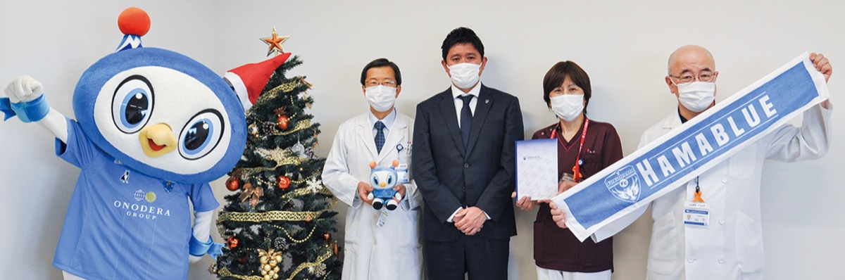 プレゼントを受け取った小松病院長は「小児病棟に入院する子どもたちに心温まるプレゼントをいただき大変感謝しています。今年度はJ1に昇格され、ニッパツ三ツ沢球技場もより一層賑わうことを楽しみにしています」などと話した。