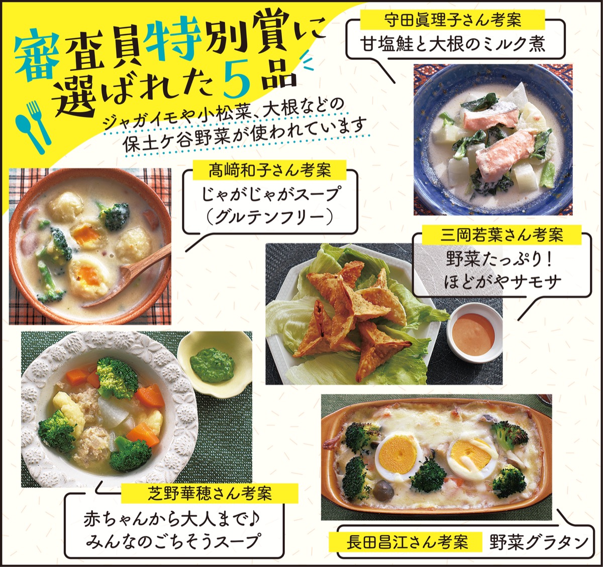 選ばれた料理は離乳食としても食べられるスープや野菜の味を活かしたミルク煮など独創性あふれるものばかり。5つのメニューのレシピは今後区役所HP内で公開される。また、3月にTSUBAKI食堂で期間限定メニューとして販売されるという。