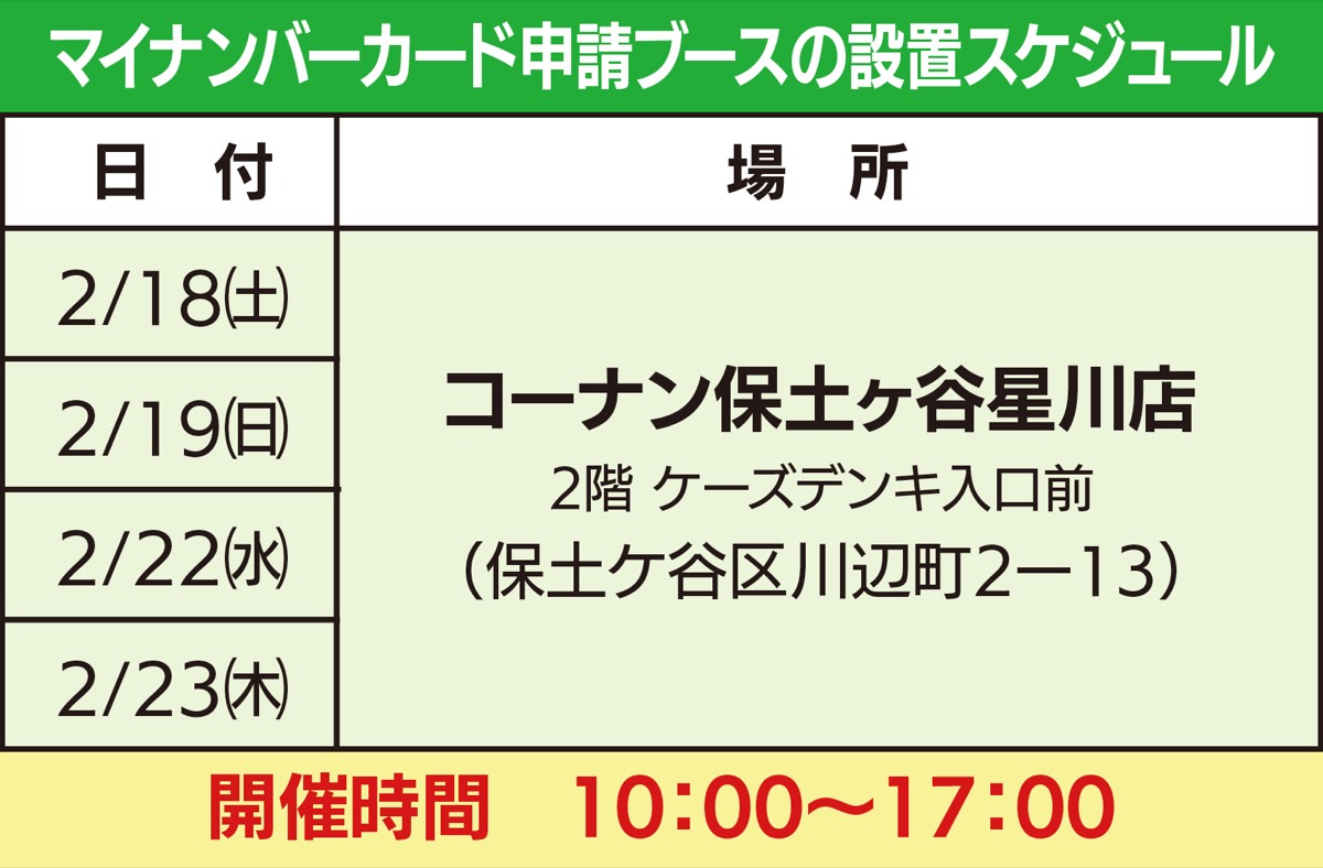 横浜市は、市民のマイナンバーカード申請の負担軽減のため、2月18日(土)・19日(日)・22日(水)・23日(木)、「コーナン保土ヶ谷星川店」で出張サポートを行う。