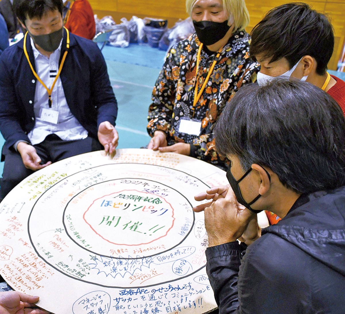 「防災」「スポーツ」「子育て」などテーマごとに集まったメンバーがそれぞれの意見を書き込める段ボール製の円卓を囲みながら、文字通り「膝を突き合わせて」アイデアを出し合った。最後は各グループが円卓を掲げながら話し合った内容を発表した。