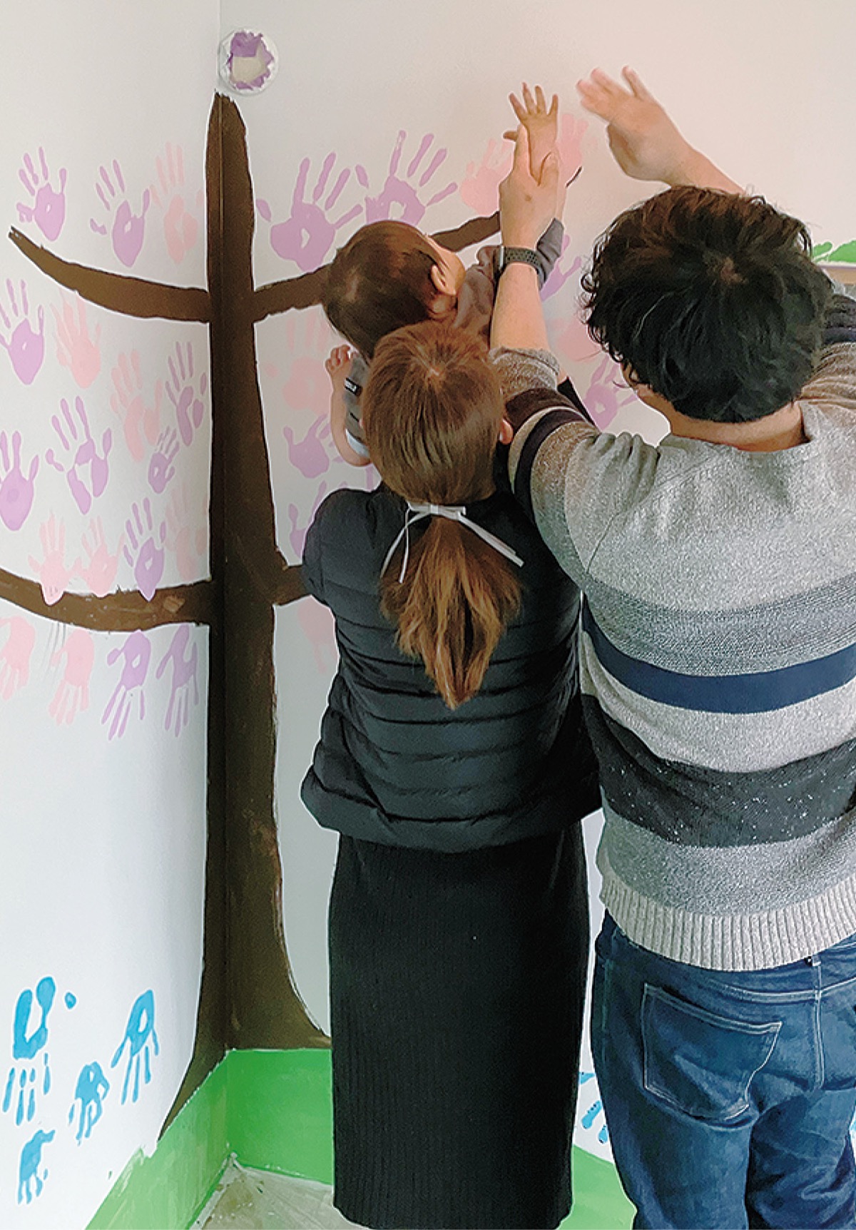 保土ケ谷区内で幼稚園などを運営する初音丘学園(渡邉啓一理事長)が、子育て世帯を中心に在園家庭に限らず地域の人々が集える場として4月に開設する「つながりハウス」で3月18日、壁面に手形を押し絵を描く「ペタペタアート」のイベントが開かれた。