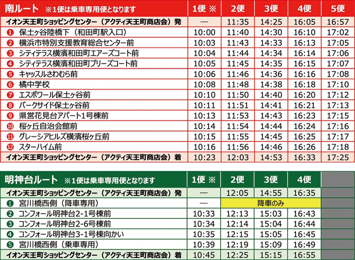 イオン天王町ショッピングセンター(中野公現店長)が4月1日から無料のお買い物バスの運行を開始した。ルートは藤塚や桜ケ丘、仏向町方面を巡回する「南ルート」と明神台を巡る「明神台ルート」の2つ。午前10時台から午後5時台まで南ルートは1日5便、明神台ルートは4便が運行する。