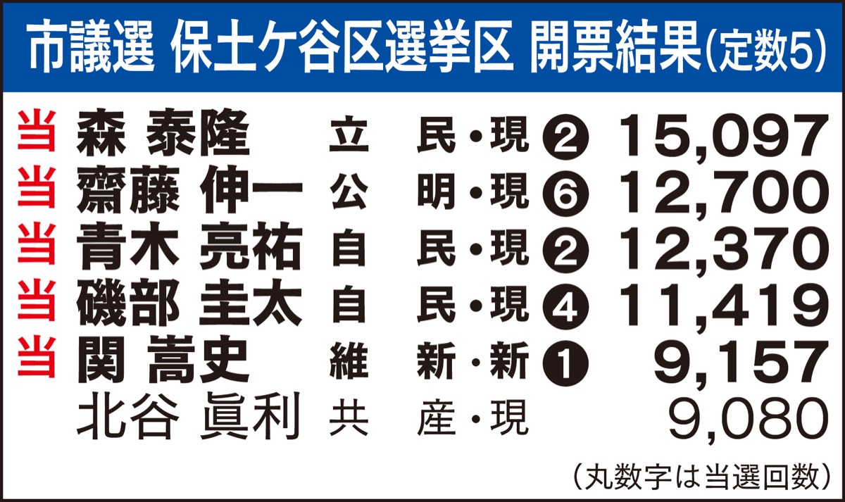 現職5人と新人1人が立候補し4月9日に投開票された横浜市会議員選挙保土ケ谷区選挙区(定数5)は立憲民主党の現職・森泰隆氏(45)が1万5097票を獲得しトップ当選となった。このほか現職3人と日本維新の会の新人・関嵩史氏(26)が当選を果たし、共産党現職の北谷眞利氏(61)は9080票を集めたが落選した。