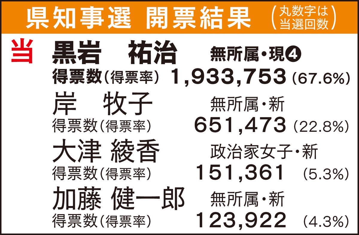 神奈川知事選挙は現職の黒岩祐治氏(68)が約193万票と圧倒的な支持を集め、3人の新人候補を退け、4度目の当選を果たした。
