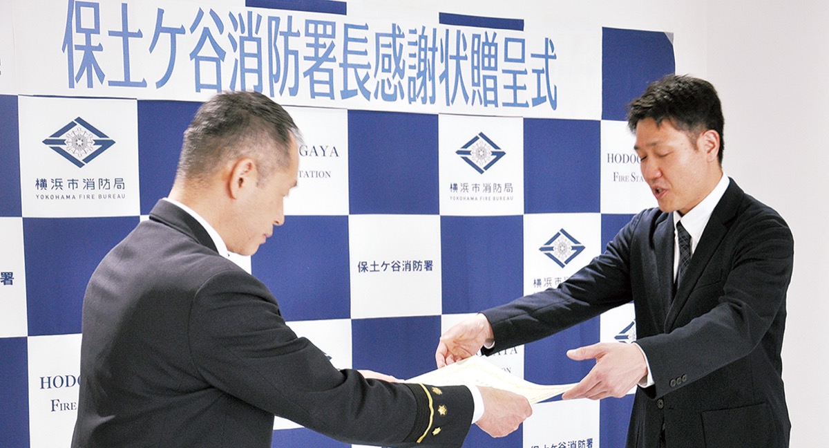 温浴施設内で心肺停止状態に陥った傷病者に対し、的確な救命措置を施したとして、保土ケ谷消防署(堀田廣公署長)は4月20日、相鉄線上星川駅前の「天然温泉満天の湯」で働く支配人の三村安宏さん(42)・原和成さん(48)・木村太さん(45)・岩崎浩明さん(51)の4人に感謝状を贈った。