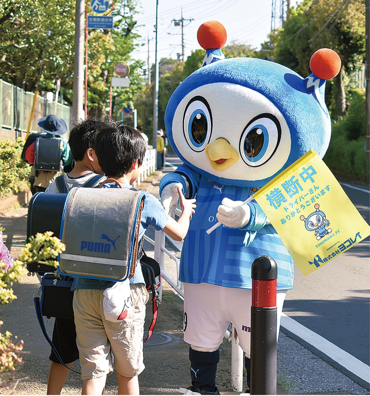 この日は登校時間に合わせて、同社社員と横浜FCマスコットのフリ丸らが横断旗を手に通学路で児童を出迎えた。