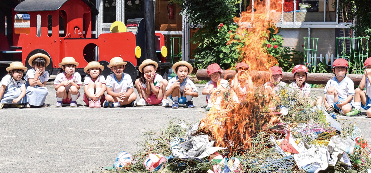 天王町のスカイハイツ幼稚園で10日、七夕飾りの短冊を燃やすことで火に浄化され煙となり、天に昇り願い事が神に届くとされる風習「笹燃やし」が行われた=写真。
