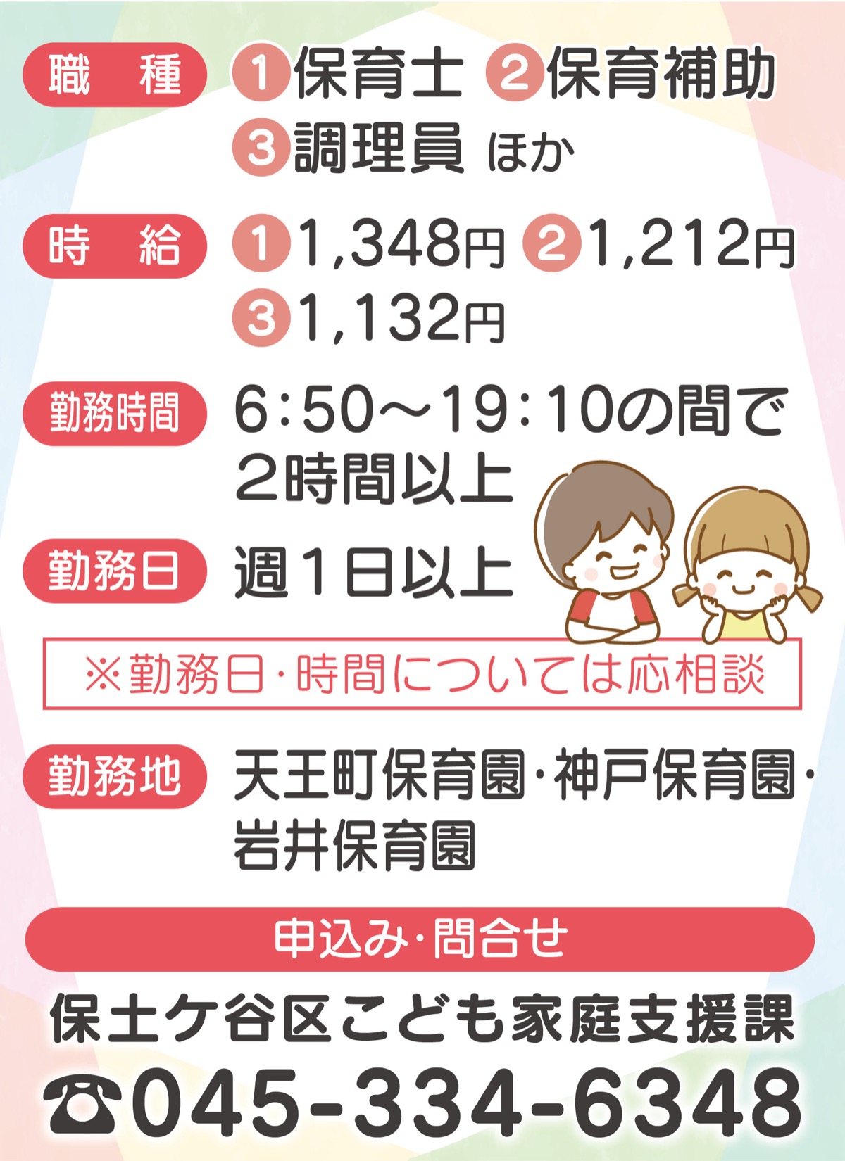 保土ケ谷区内3つの公立保育園がスタッフを募集している。区役所で前もって登録すると、スタッフの空き状況により園から随時連絡がいく、事前登録制。