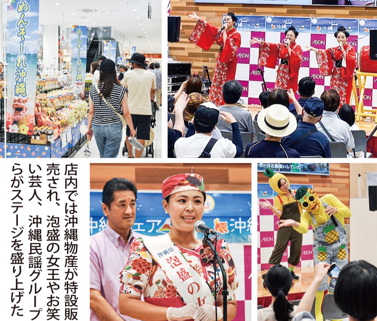 沖縄フェアは2011年に同県とイオンが結んだ包括的連携協定の一環として開催されている。天王町店での開催は初めてで、店内に特設されたステージでは「泡盛の女王」に選ばれた前泊選香さんが泡盛の美味しい飲み方を紹介したほか、沖縄のお笑い芸人「凸凹トラベリング」がクイズなどを交えながら沖縄をPR。子ども向け番組「ひらけ!ポンキッキ」で「ユイユイ」を歌い全国デビューしたのをきっかけに結成された「ゆいゆいシスターズ」は沖縄民謡などを披露し、沖縄気分を盛り上げた。