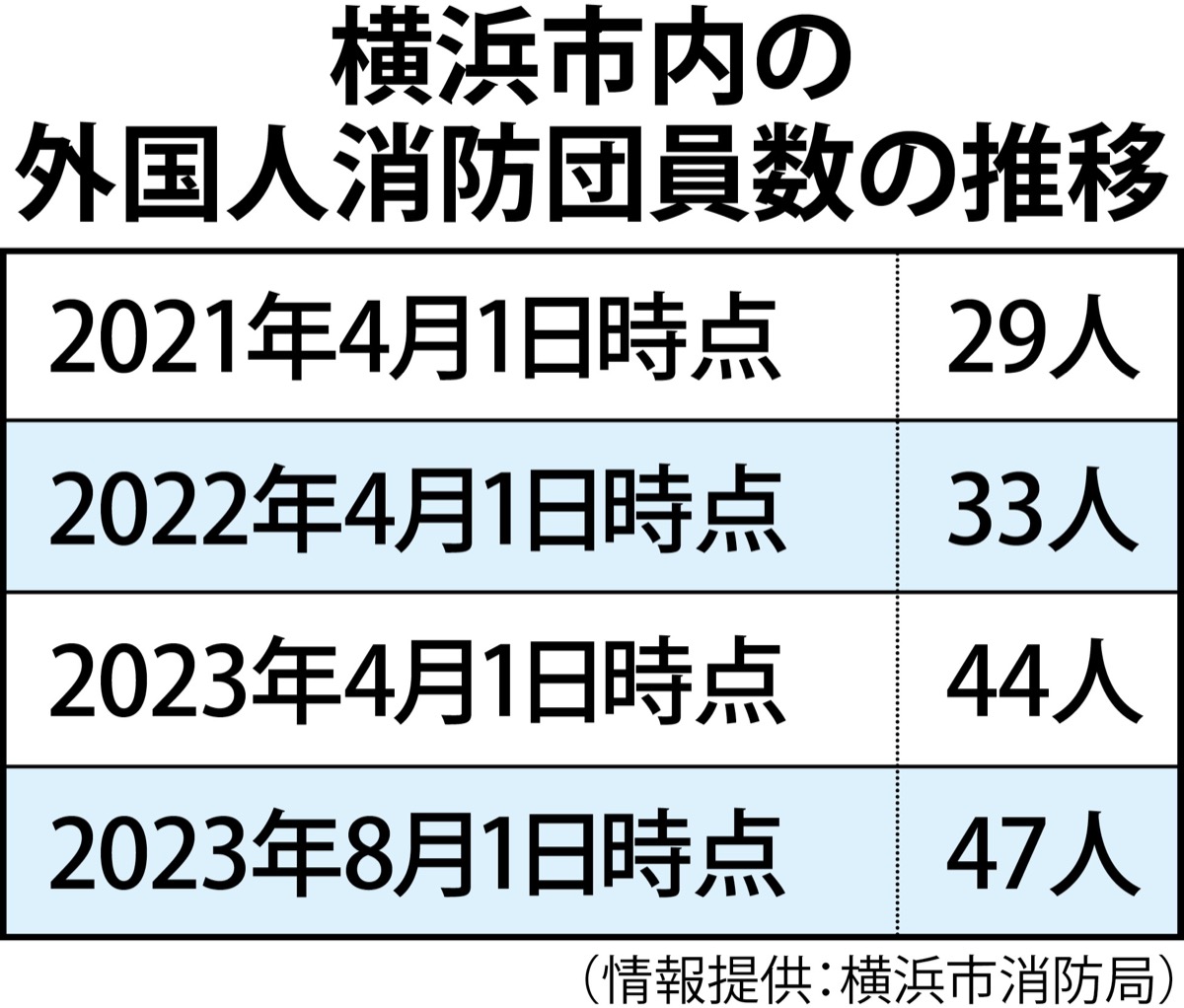 任用開始後、市内の20消防団で入団数の多寡はあるものの、外国人団員総数は年々増加。今年8月1日現在では47人が活動に従事しており、国籍別では中国人が最多(22人)で、次いで韓国人(8人)、ネパール人(5人)などと続く。市消防局の担当者は「使命感を持って入団してくれてありがたい」と話す。