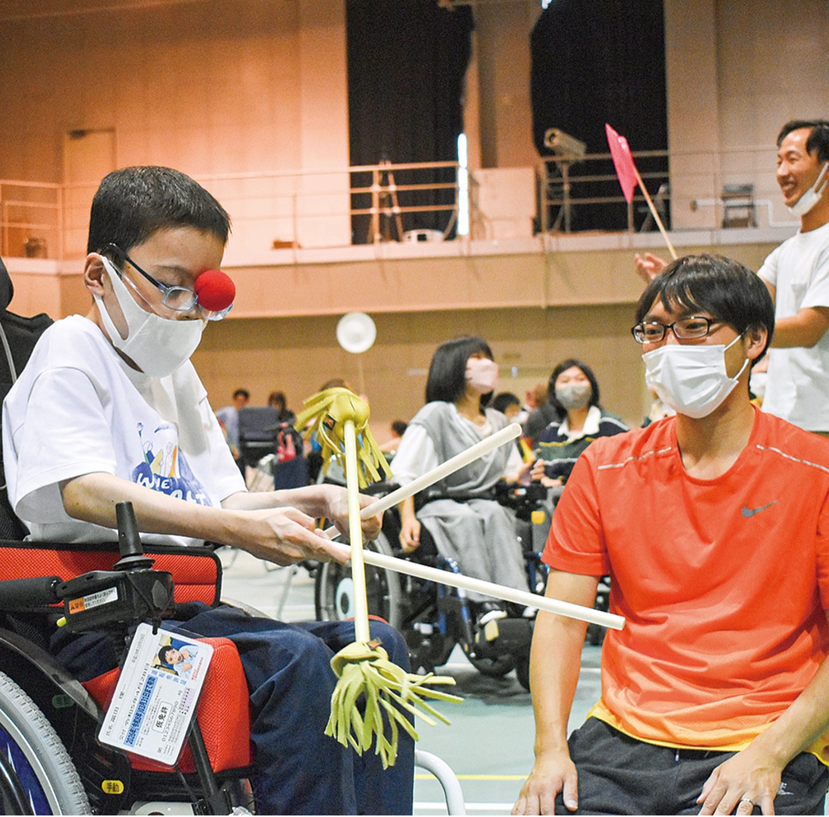 肢体不自由の程度が比較的軽い児童生徒が通う市立上菅田特別支援学校の高等部生徒らが8月31日、「ソーシャルサーカス」と呼ばれるサーカスの道具を用いてコミュニケーションを行うプログラムを体験した。