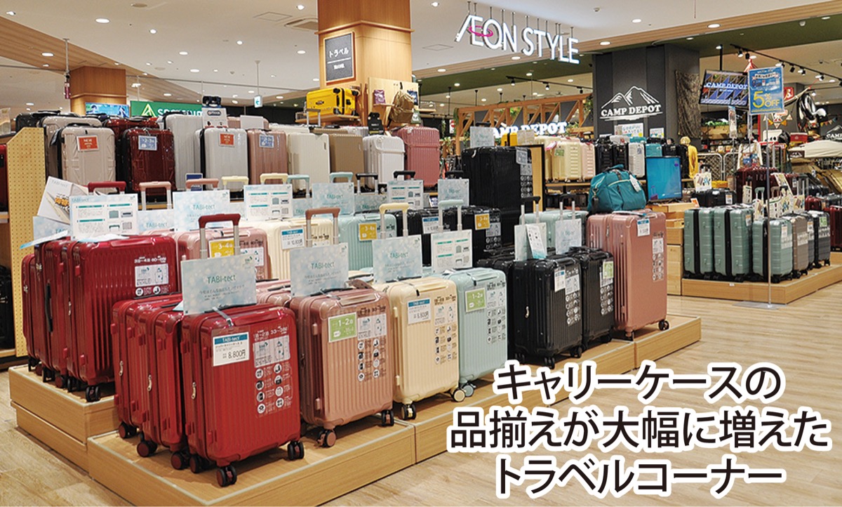 旅行需要が高まりを見せる中、「トラベル用品」売場を拡大。地域最大級のトラベル用品売場では、キャリーケースの品揃えを増やし、圧縮袋やアイマスクなど小物類も充実させた。
