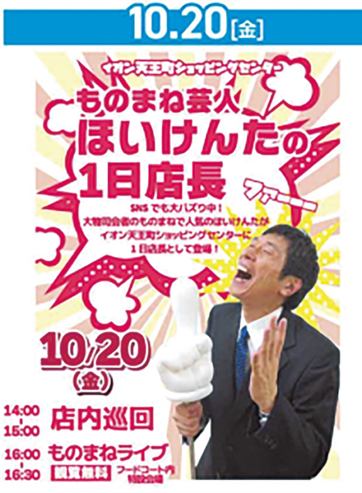 あす20日(金)には大物司会者のものまねで話題となっている芸人「ほいけんた」さんが1日店長として登場する。ものまね声で館内放送をするほか、午後2時からは店内を巡回。さらに4時からはものまねライブが開かれる。