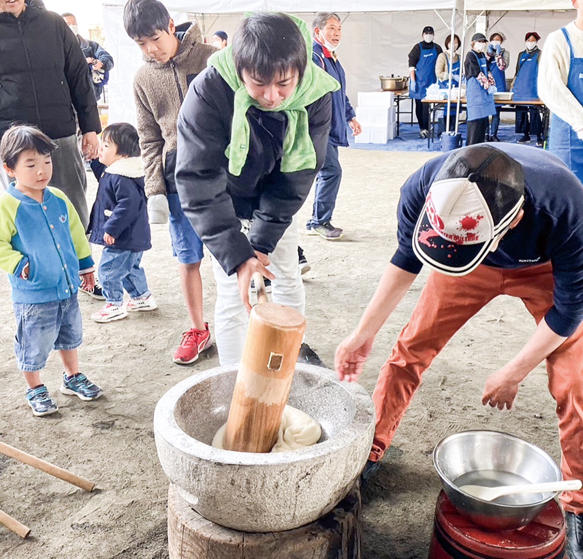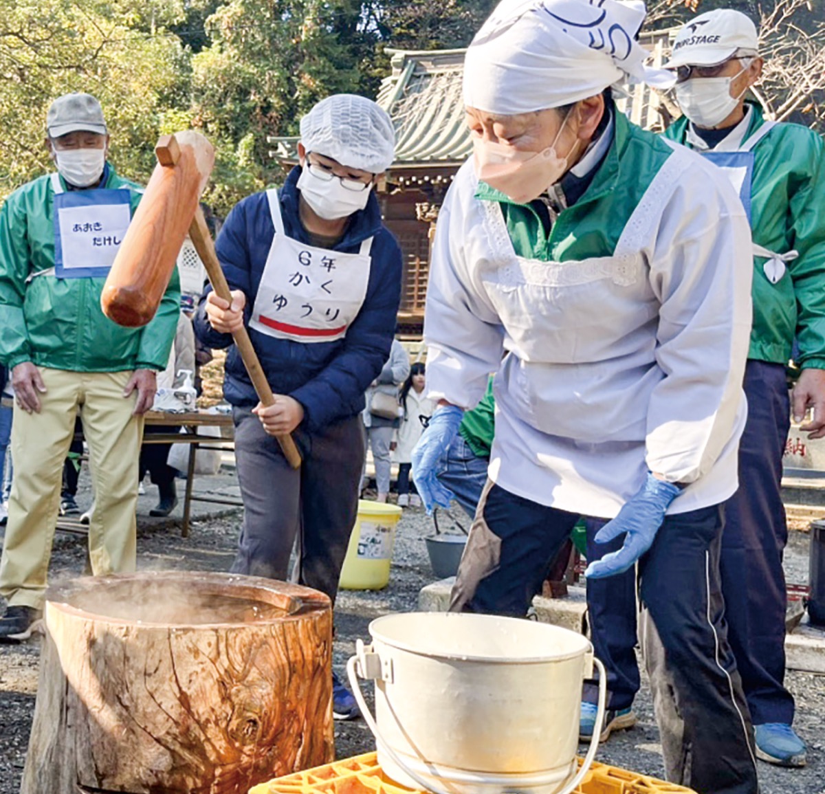 和田西部町内会(宇佐美勝彦会長)でも3日、恒例の餅つき大会を開催=写真右。1989年に始まった取り組みで地域に師走の訪れを告げる行事として定着している。この日は地域住民らが一斗張りの石臼で餅つきを体験。親子連れらが「よいしょ」という掛け声に合わせ杵を振り、つきたてのきなこ餅やあんこ餅などを販売。売上金は区社会福祉協議会に寄付するという。