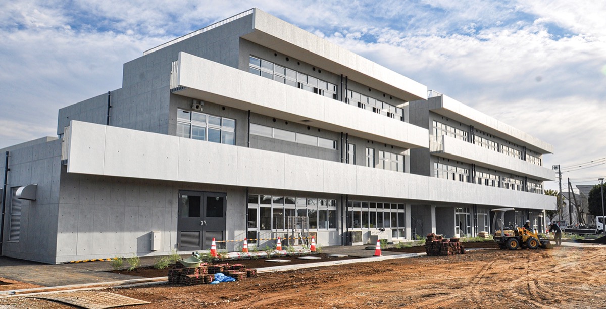 23年3月までの竣工をめざし工事が始まり、当初、今年度からは新校舎での授業開始が予定されていたが、地盤改良工事の必要性が発生したため工期を延長。昨年10月に竣工し、11月から12月にかけて植栽や引っ越し作業が行われていた。