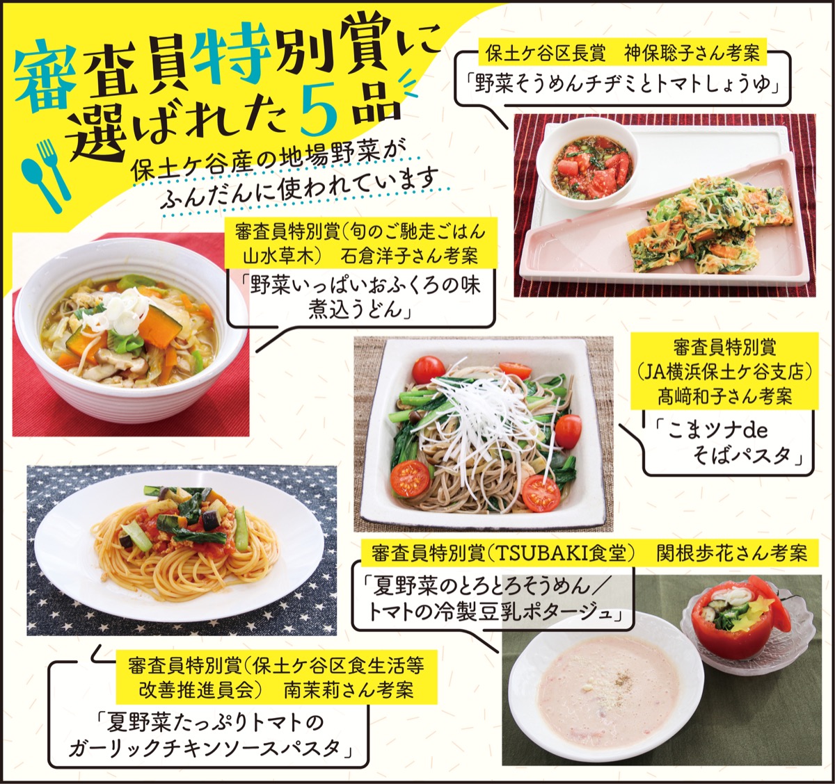 各賞の受賞作品は▽区長賞「野菜そうめんチヂミとトマトしょうゆ」(神保聡子さん)▽旬のご馳走ごはん山水草木賞「野菜いっぱいおふくろの味煮込うどん」(石倉洋子さん)▽保土ケ谷区食生活等改善推進員会賞「夏野菜たっぷりトマトのガーリックチキンソースパスタ」(南茉莉さん)▽JA横浜保土ケ谷支店賞「こまツナdeそばパスタ」(高崎和子さん)▽TSUBAKI食堂賞「夏野菜のとろとろそうめん/トマトの冷製豆乳ポタージュ」(関根歩花さん)
