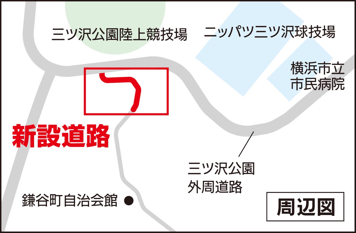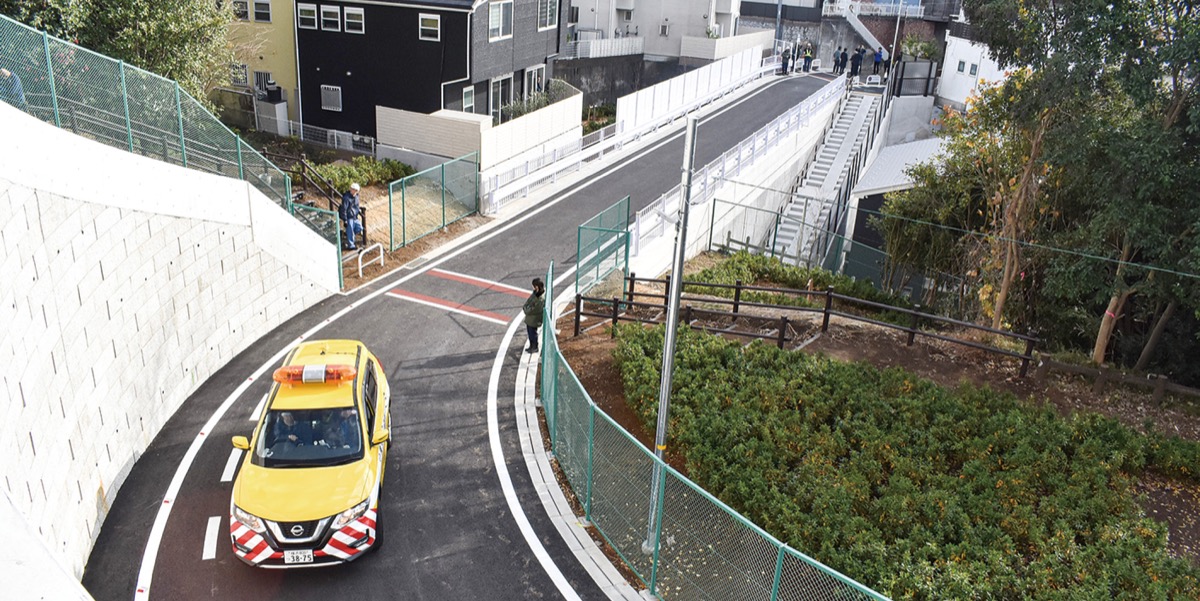 鎌谷町と三ツ沢公園の外周道路をつなぐ新設道路が昨年12月19日に開通した。同道路周辺はこれまで消防車などの緊急車両が時間帯によっては進入できなかったが、これにより外周道路から町内への進入(一方通行のため緊急車両のみ逆走可)が可能となった。