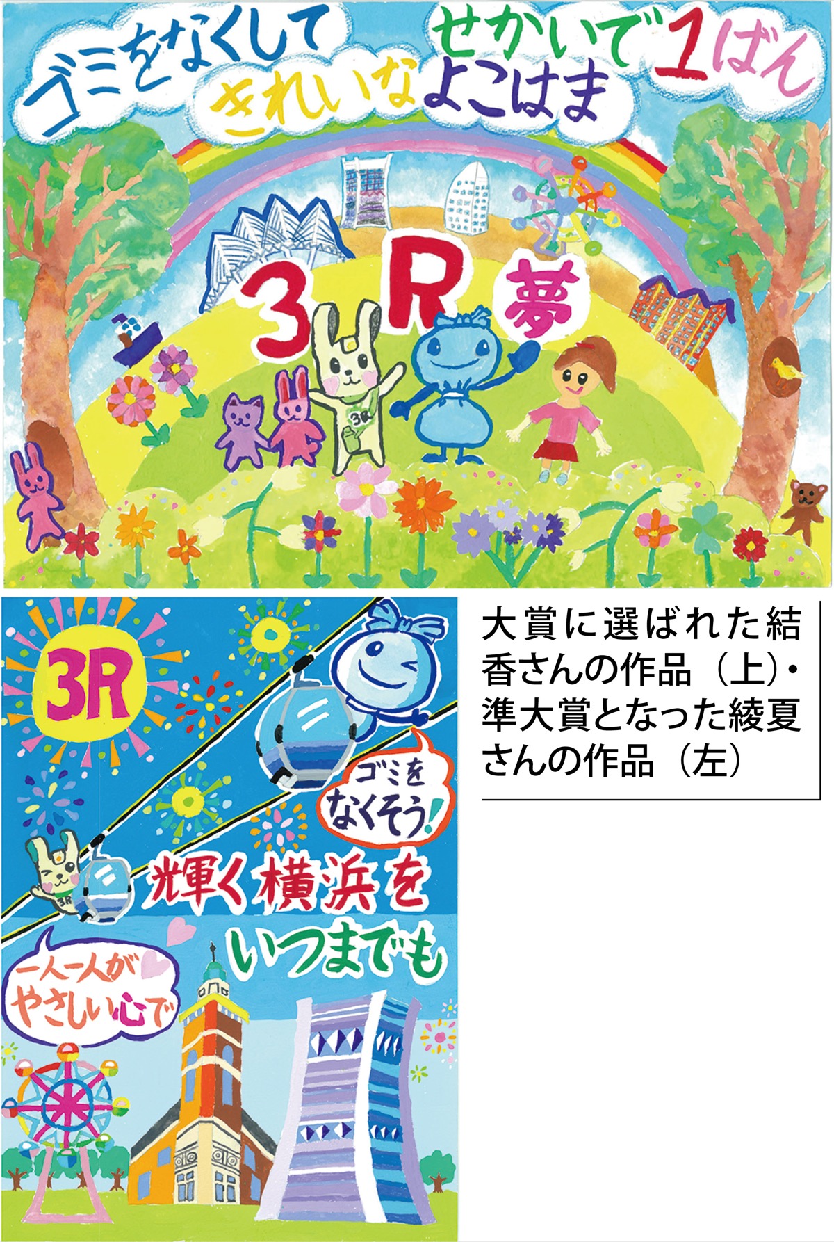 ごみの分別や3R、まちの美化行動を起こすきっかけづくりとして市が小中学生を対象に募集した「ヨコハマ3R夢(スリム)!」ポスターコンクールで保土ケ谷小学校に通う府川結香さん(2年)と綾夏さん(4年)が手掛けた作品が揃って入賞した。結香さんは小学校低学年の部の最高位となる「ヨコハマ3R夢大賞」に、綾夏さんの作品は高学年の部の準大賞となる「3R夢ミーオ・イーオ賞」に選ばれた。