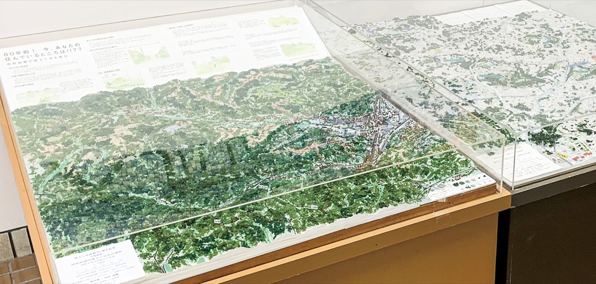 保土ケ谷公会堂に昭和初期の保土ケ谷をテーマにした立体地図が展示され、来場者の関心を集めている。