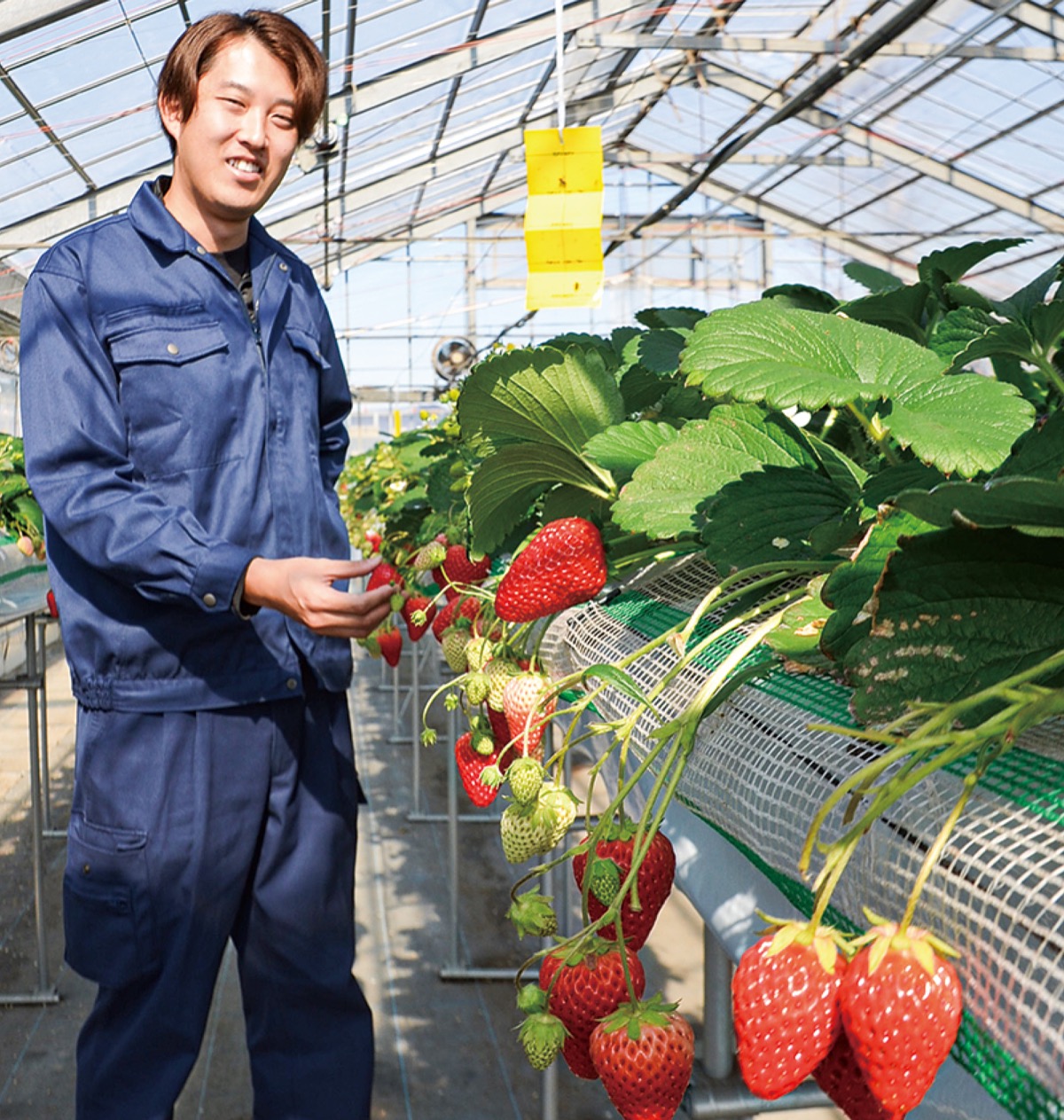 保土ケ谷区内の農家としては最も若い世代の一人。感性と発想力は大きな強みだ。ハウスの有効活用を思案し、区内では栽培している農家がない「イチゴ」に着目した。栽培槽を作業しやすい位置に設置した養液栽培システムを導入し、現在はイチゴ本来の甘酸っぱさとコクを味わえる「紅ほっぺ」と希少種「よつぼし」の2品種を栽培している。