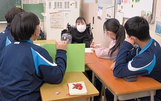 生徒は電動車いすサッカー選手として活躍する永岡真理さんなどの日常に密着した映像作品を事前に見た上で授業に出席。永岡さんたちと交流し、障害の有無に分け隔てられることがなく、個性を尊重し合いながら共生することが大切だと学んだ。同校の森口宏紀教諭は「生徒は価値観や視野を広げられたはず」と学習を振り返った。