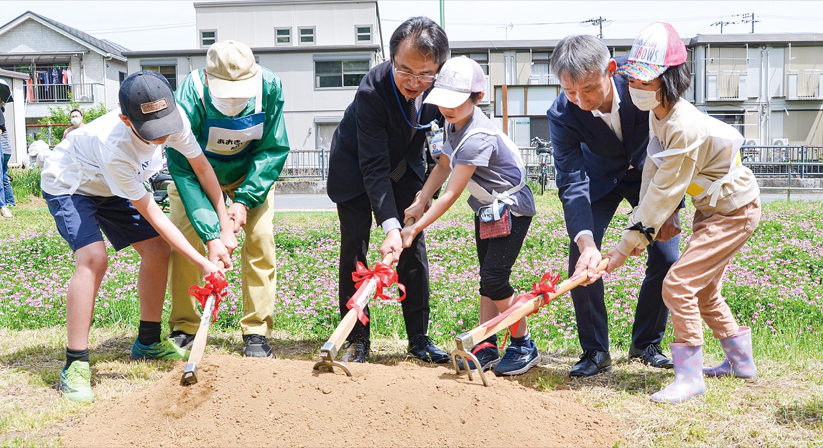 保土ケ谷区内に残る唯一の水田を利用して子ども向けの伝統農業体験教室などを行っている川島町の「ほどがや☆元気村」(青木毅村長)で4月20日、1年間にわたって米や野菜作りを学ぶ「どろんこ教室」の開村式が行われ、小学生や関係者が方豊作を願い鍬入れ式に臨んだ。
