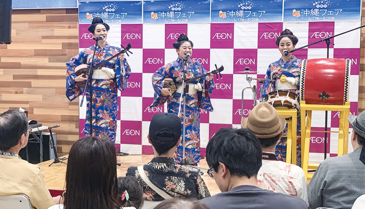 沖縄フェアは2011年に同県とイオンが結んだ包括的連携協定の一環として開催されている。天王町店での開催は昨夏に続き2度目。この日、店内に特設されたステージでは、子ども向け番組「ひらけ!ポンキッキ」で「ユイユイ」を歌い全国デビューしたのをきっかけに結成された「ゆいゆいシスターズ」が、沖縄民謡などを披露した=写真=ほか、沖縄出身のお笑いコンビ「ゴリラコーポレーション」も笑いを交えながら沖縄の魅力をPRした。