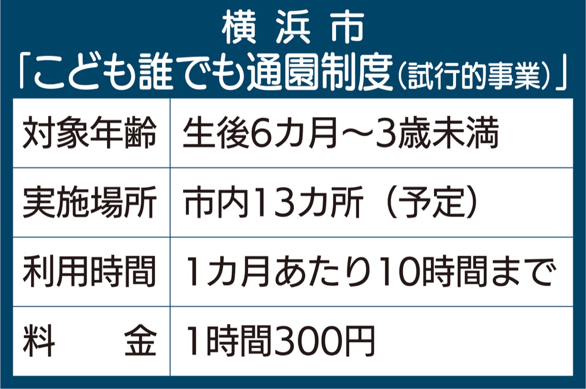 横浜市は、親が働いていなくても保育所などに子どもを預けられる「こども誰でも通園制度」の試行的事業を6月下旬から始める。21日以降に利用者の募集を順次開始。市は利用者の条件を「定期利用」に限定し、未就園児家庭の社会的孤立や育児負担軽減につなげていく。