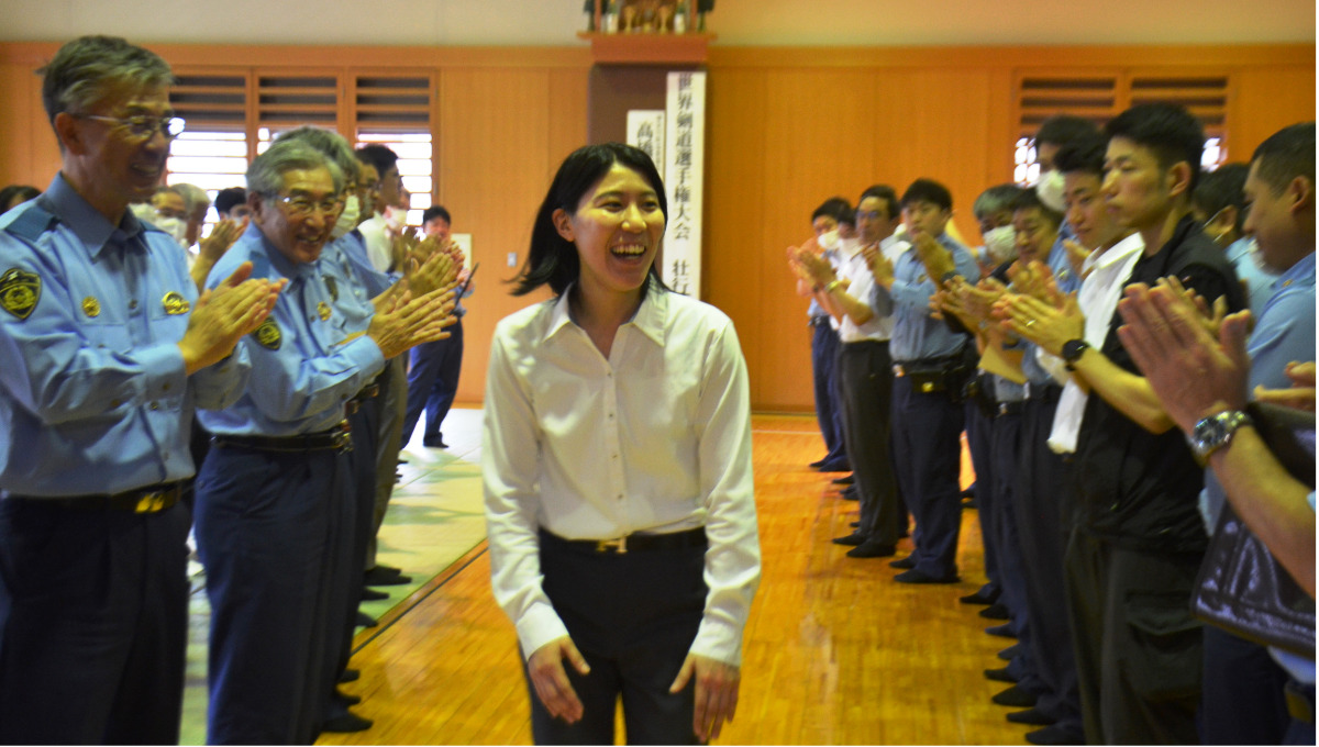高橋さんは壮行会に集まった署員の前で、「仕事で剣道をしているからこそ、神奈川県警の名声を高められるように剣道で貢献したい。自分らしい剣道をして、目指すは優勝」などと意気込みを語った。その後、花道を歩く高橋さんに向けて署員から大きな拍手とエールが送られた。