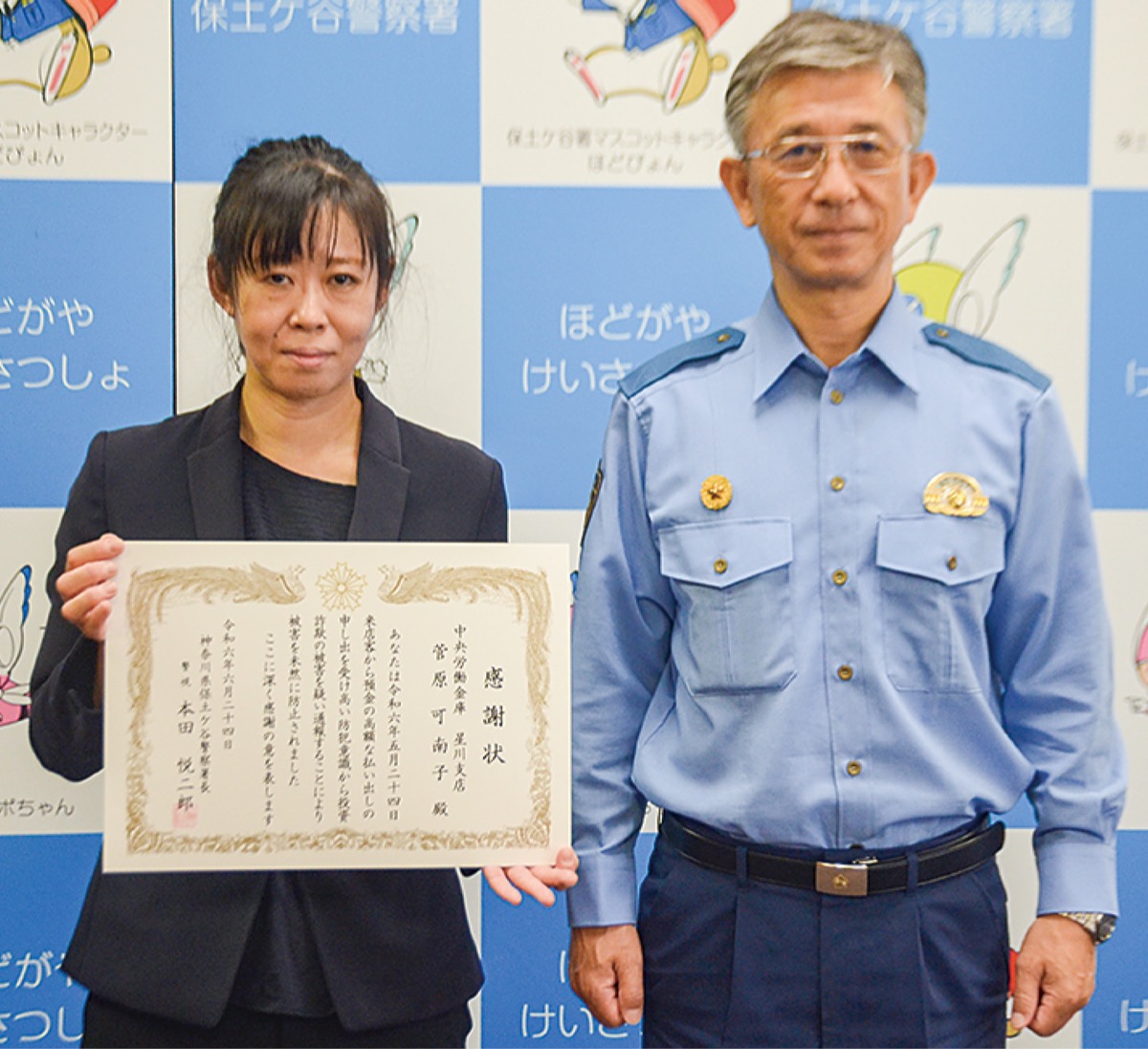 中央労働金庫星川支店の職員が投資詐欺を未然に防いだとして、6月24日、保土ケ谷警察署(本田悦二郎署長)から感謝状を受け取った。