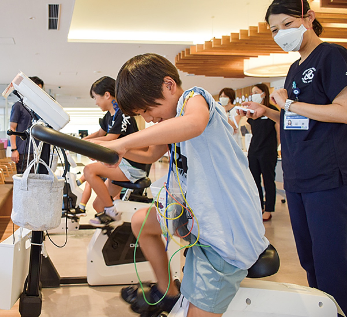 当日は30人の子どもたちが参加。子どもたちは5つのグループに分かれて理学療法士、臨床検査技師、看護師、臨床工学技士など心臓に関わる医療従事者の仕事を体験した。理学療法士のコーナーでは、リハビリの際に使用するエルゴメーターに乗車。子どもたちは、約3分間ペダルをこいだ後にどれだけ心拍数が変化したかを体験した。臨床検査技師の仕事を体験するコーナーでは、エコーを使用して固められた寒天の中に隠された野菜などを当てる宝探しに挑戦。宝探しをしながら超音波検査の仕組みなどを学んでいた。