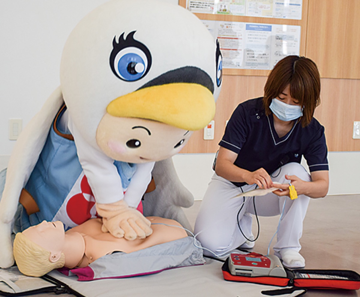 また、看護士の指導で心臓マッサージやAED(自動体外式除細動器)の使用方法を学ぶ場面では、日本循環器学会の禁煙啓発キャラクター「すわん君」が手本を披露する姿があった。