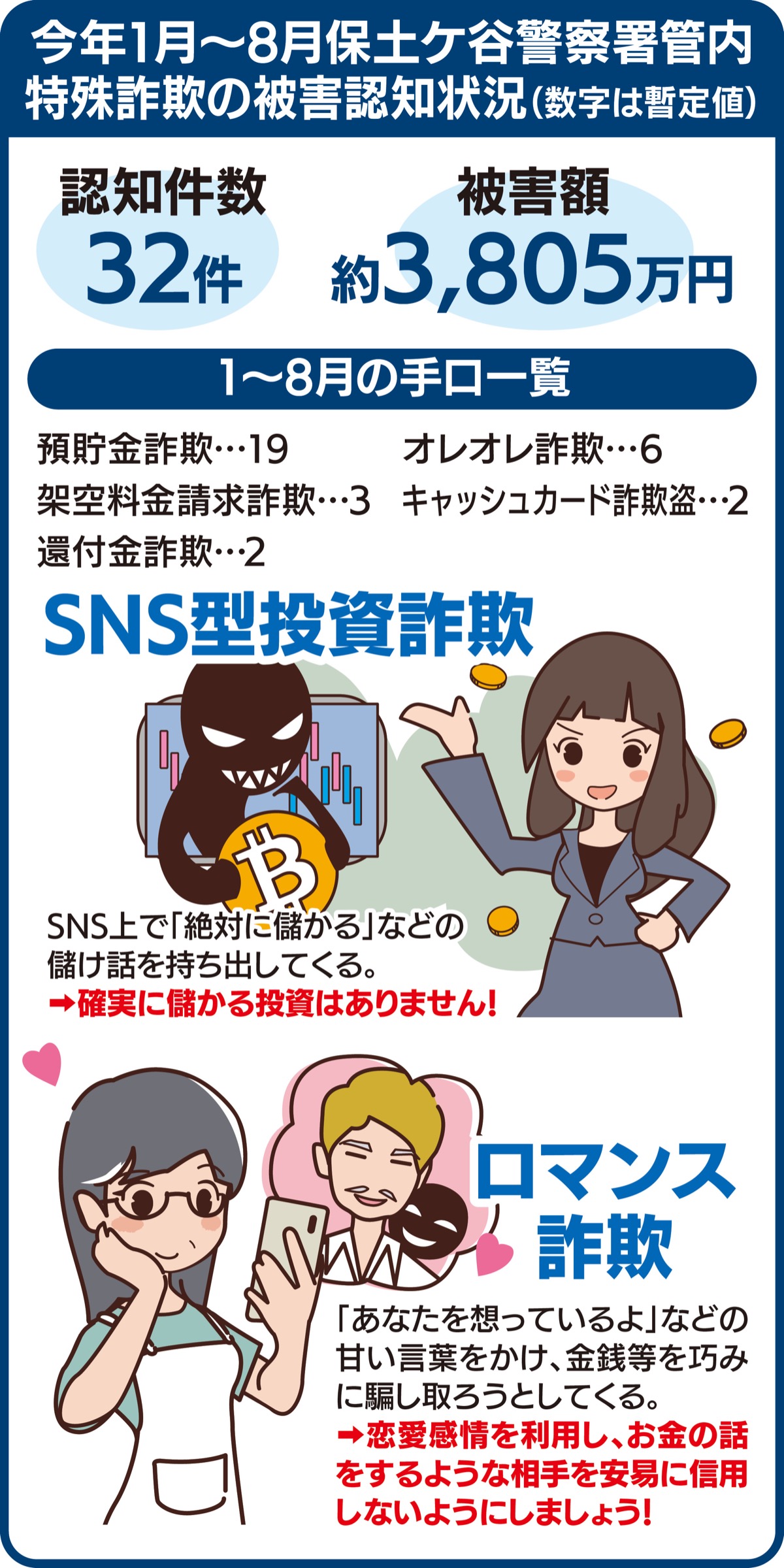 保土ケ谷警察署によると、今年1月から8月末までに発生したオレオレ詐欺などの特殊詐欺の認知件数は32件、被害額は3805万円(暫定値)。昨年同時期から被害額は7778万円減少したが、認知件数は5件増えており、予断を許さない状況が続く。