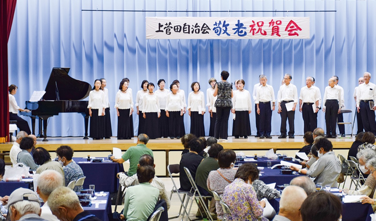 上菅田自治会(松野正敬会長)の敬老祝賀会が9月22日、上菅田笹の丘小学校の体育館で実施され約160人が参加した。