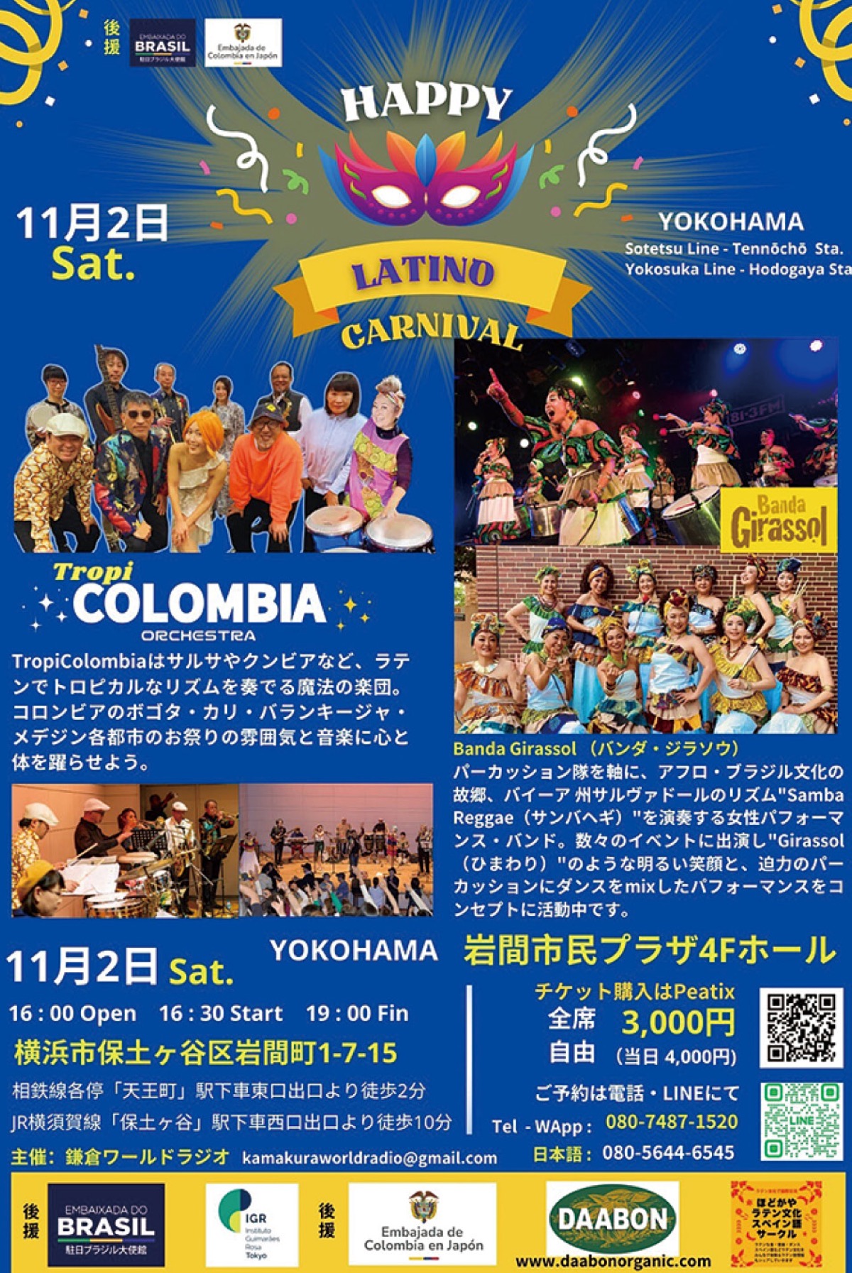 岩間市民プラザ(岩間町1の7の15)4階ホールで11月2日(土)、コロンビア音楽とブラジル音楽のコンサート「HAPPYラテン・カーニバル」が開催される。鎌倉ワールドラジオの主催。午後4時30分開演(4時開場)。