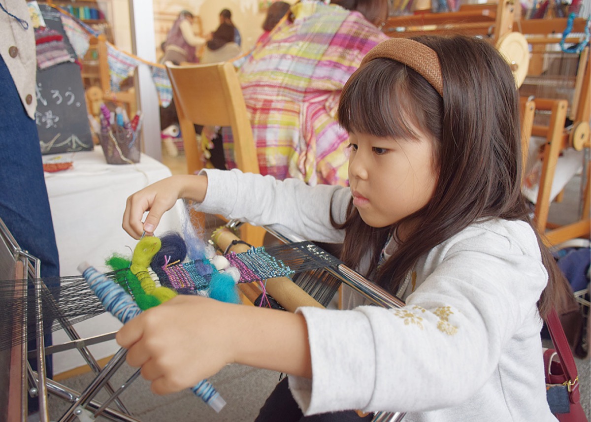 「手織工房じょうた」で「さをり織り」の織り機でポーチ作りを体験した浅井詞葉(ことは)さん(峯小1年)は「好きな水色や紫の糸を選んだ。難しかったけど楽しかった」と笑顔を見せた。