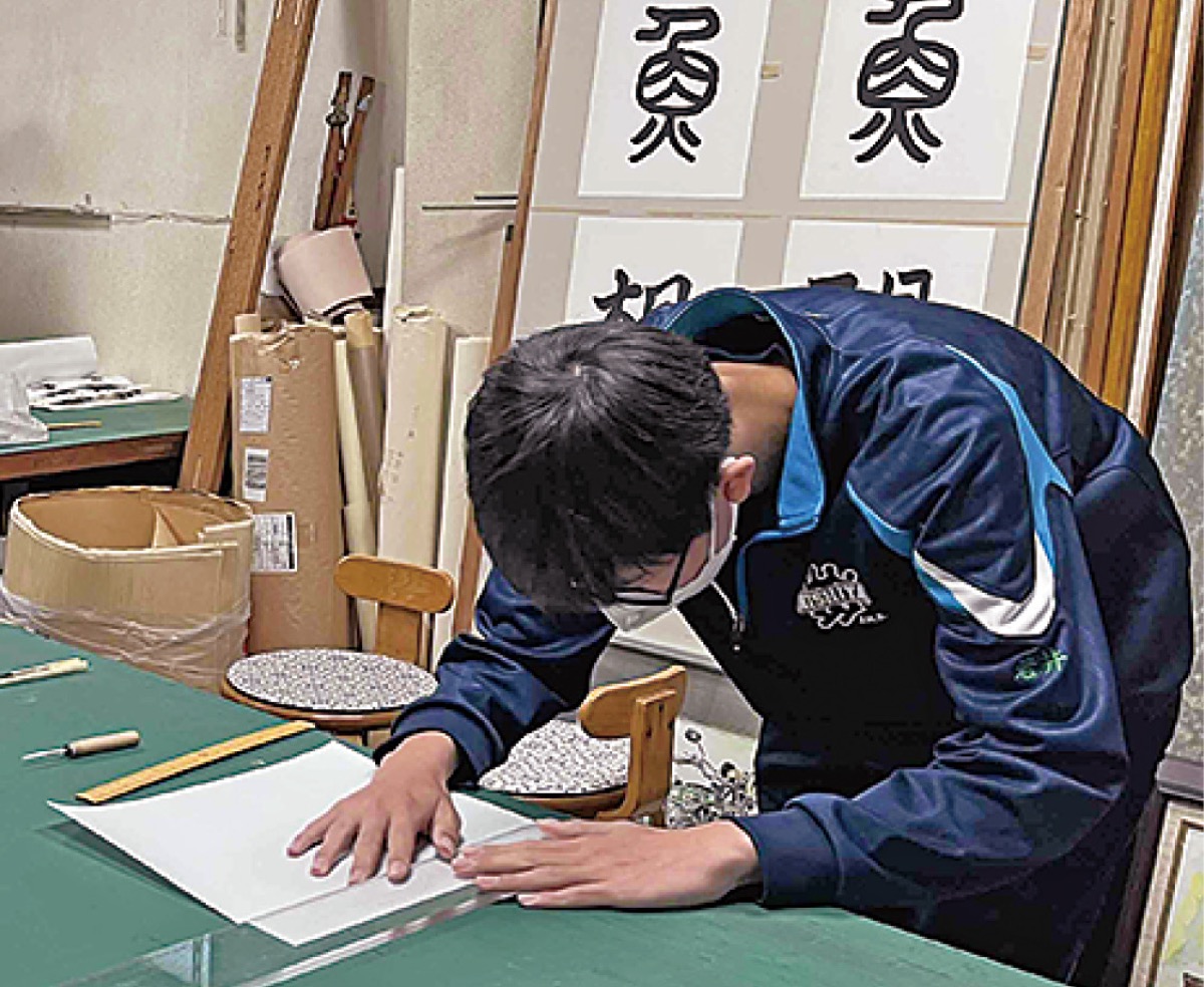 今回、同店での職業体験に参加したのは西谷中の岩井陽哉さん(2年)と加藤翔さん(同)。2人は幼少期からものづくりが好きで、経師の仕事に興味を示したという。
