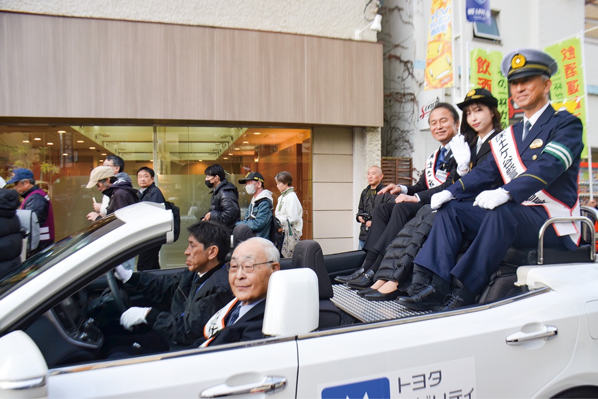 オープンカーの前方では、天王町のスカイハイツ幼稚園の園児が「年末の交通事故防止運動」と書かれた横断幕を持ちながら交通事故に対して注意喚起。寒空の下、一生懸命練り歩いていた。