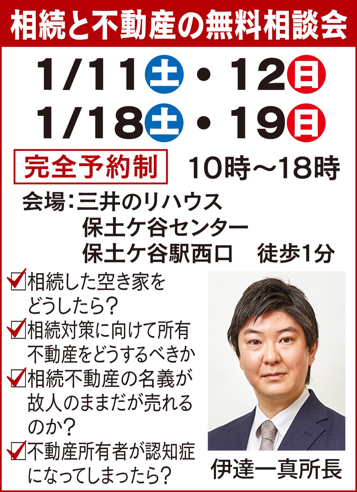 家族の集まりで話題になった「相続した空き家」「放置した土地」――。この文言にピンと来た人に勧めたいのが、保土ケ谷駅近く、三井のリハウス保土ケ谷センターの「相続と不動産の個別無料相談会」。日にちは1月11日(土)・12日(日)・18日(土)・19日(日)。時間は午前10時〜午後6時のうち1時間。秘密厳守のため、完全予約制。